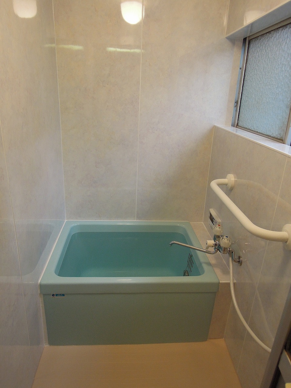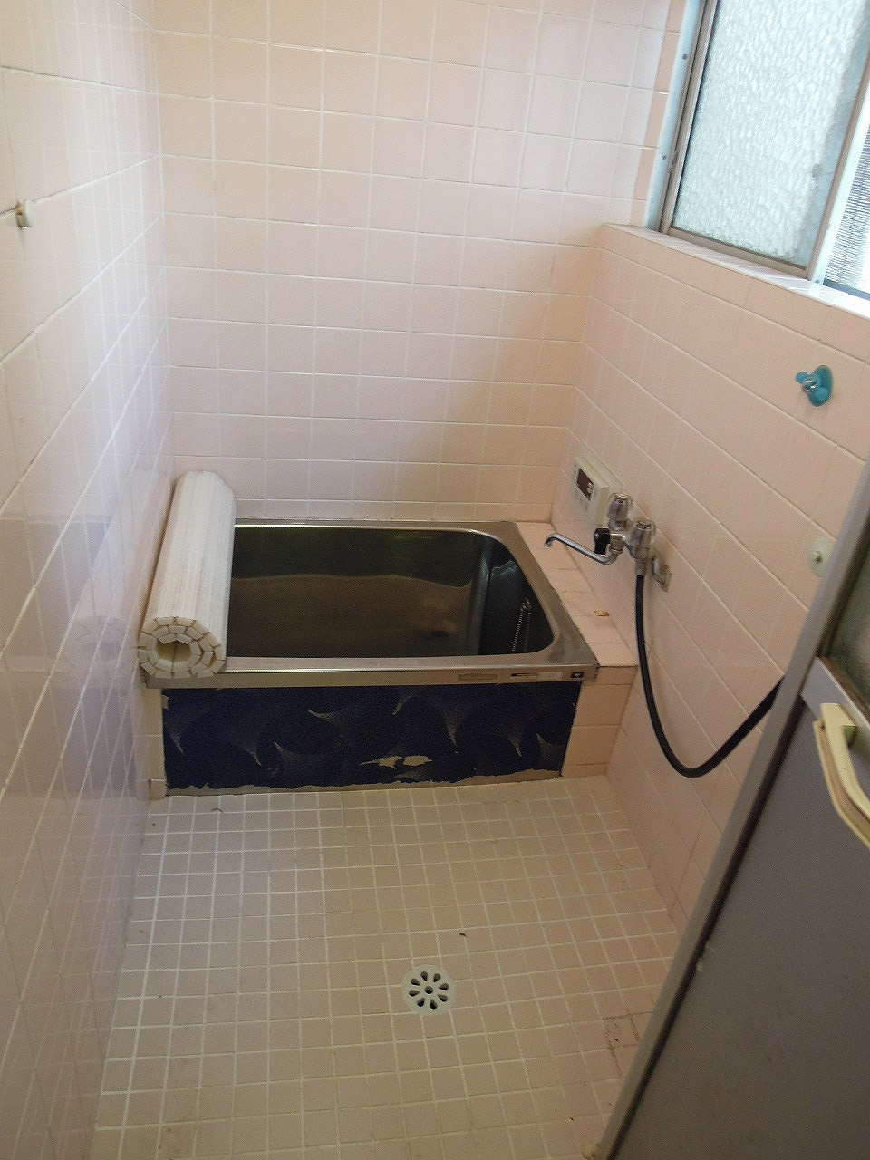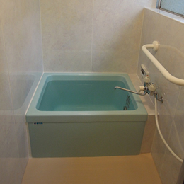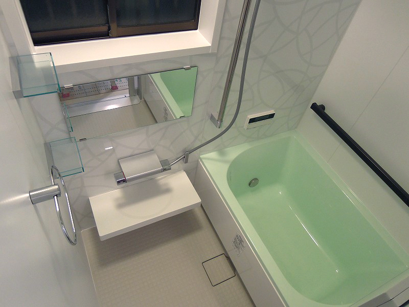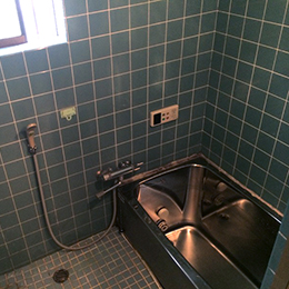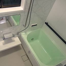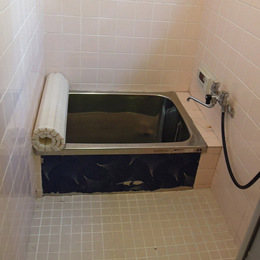 | 概要 | 在来工法浴室で、既製品規格寸法のユニットバスが無い為 新規FRP浴槽交換・壁面耐水性化粧合板浴室用パネル貼り 床面は浴室用長尺シート(衝撃吸収重視型)貼り |